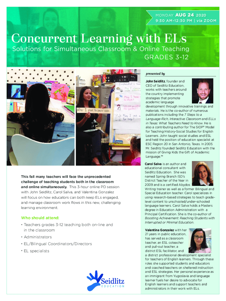 MONDAY AUG 24 2020 9:30 AM12:30 PM via ZOOMConcurrent Learning with Solutions for Simultaneous Classroom & Online Teaching GRADES 312 presented by John Sailing, founder and CEO of Sailing Education,
