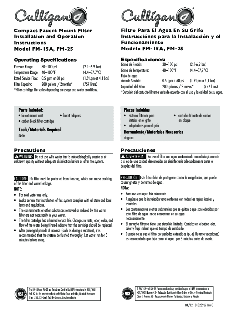Model FM15A, FM25Filtro Para El Agra En SU Gift