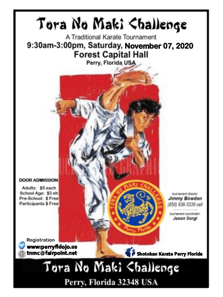 November 07, 2020Registrationwww:perryfldojo.us TMC fair point.netShotokan Karate Perry Florida9:30am2:00pm, Saturday, November 07, 2020, tournament site Forest Capital Hall, 203 Forest Park Drive,