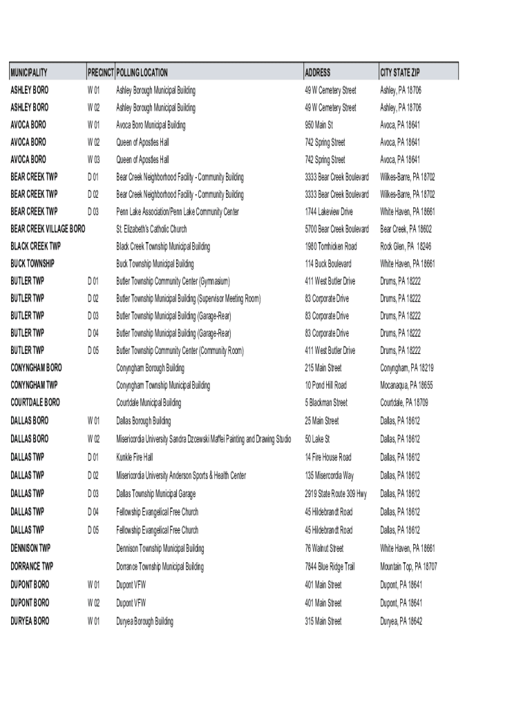 MUNICIPALITYPRECINCT POLLING LOCATIONADDRESSCITY STATE ASHLEY BORROW 01Ashley Borough Municipal Building49 W Cemetery Street Ashley, PA 18706ASHLEY BORROW 02Ashley Borough Municipal Building49 W Cemetery