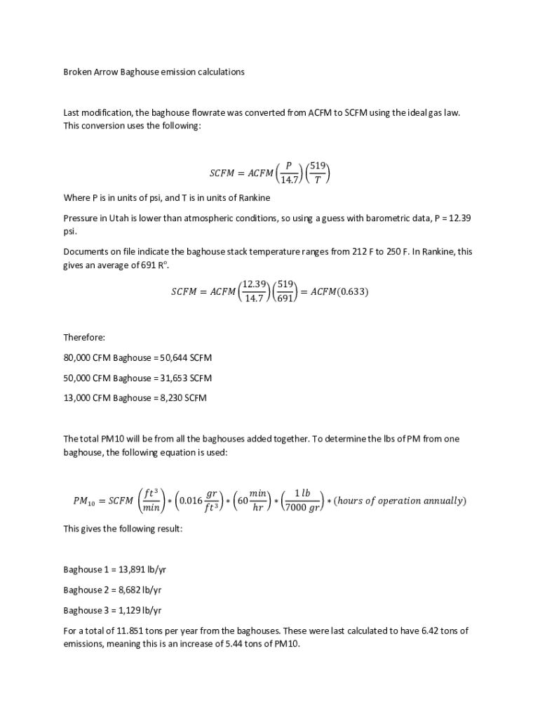 Broken Arrow Bag house emission calculationsLast modification, the bag house flow rate was converted from ACM to SCAM using the ideal gas law. This conversion uses the following: Where P is in units