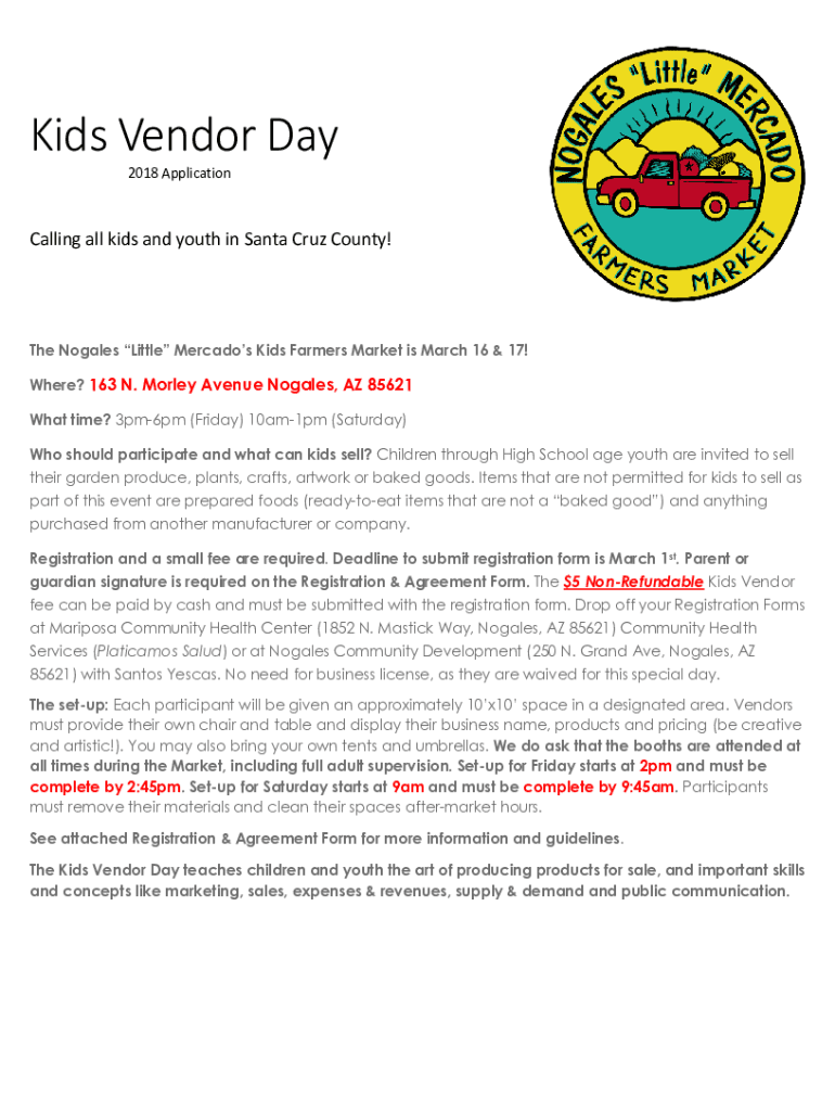 Kids Vendor Day 2018 ApplicationCalling all kids and youth in Santa Cruz County! The Nogales Little Mercado's Kids Farmers Market is March 16 & 17! Where? 163 N. Morley Avenue Nogales, AZ 85621 What