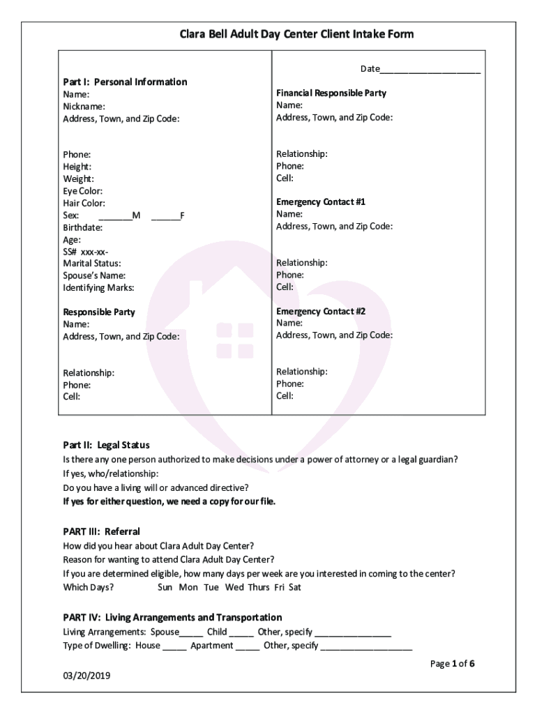 Clara Bell Adult Day Center Client Intake Form Date Part I: Personal Information Name: Nickname: Address, Town, and Zip Code:Financial Responsible Party Name: Address, Town, and Zip Code:Phone: Height: