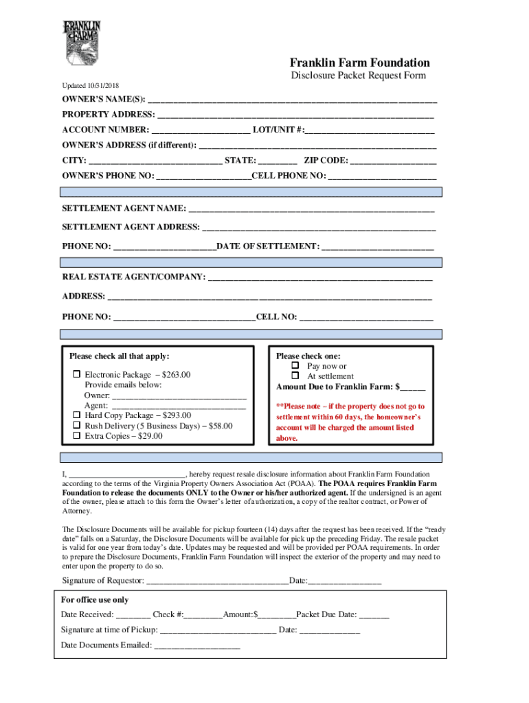 Franklin Farm Foundation Disclosure Packet Request Form Updated 10/31/2018OWNERS NAME(S): PROPERTY ADDRESS: ACCOUNT NUMBER: LOT/UNIT #: OWNERS ADDRESS (if different): CITY: STATE: ZIP CODE: OWNERS