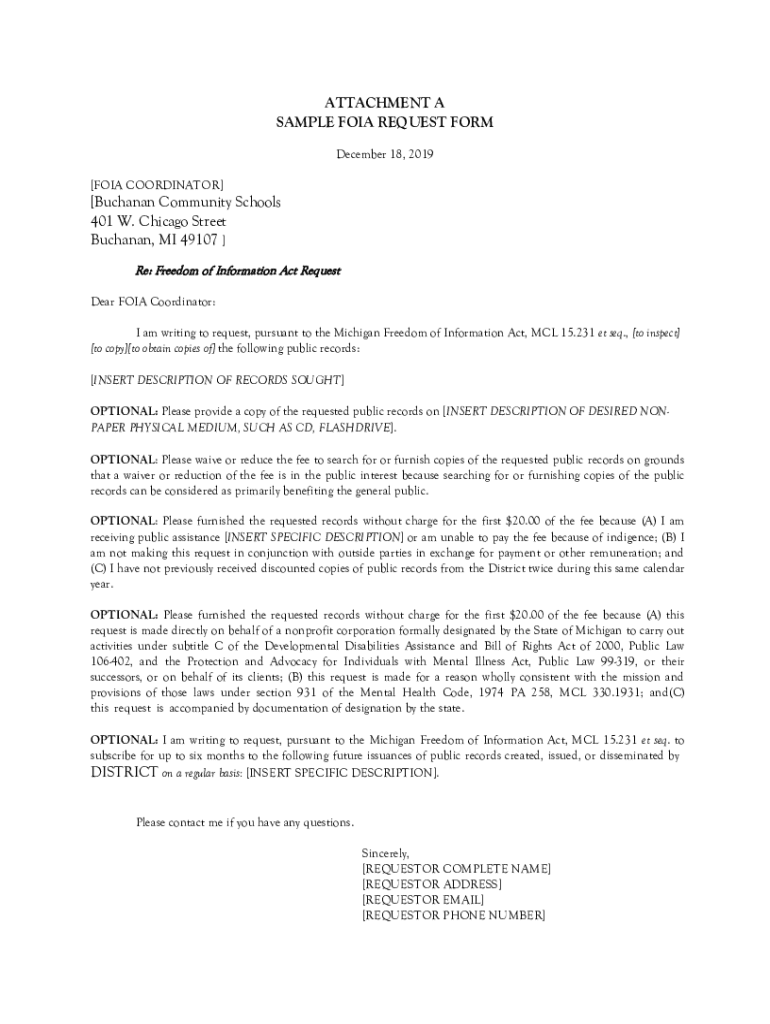 ATTACHMENT A SAMPLE FOIA REQUEST FORM December 18, 2019, FOIA COORDINATOR Buchanan Community Schools 401 W. Chicago Street Buchanan, MI 49107 Re: Freedom of Information Act Request Dear FOIA Coordinator: