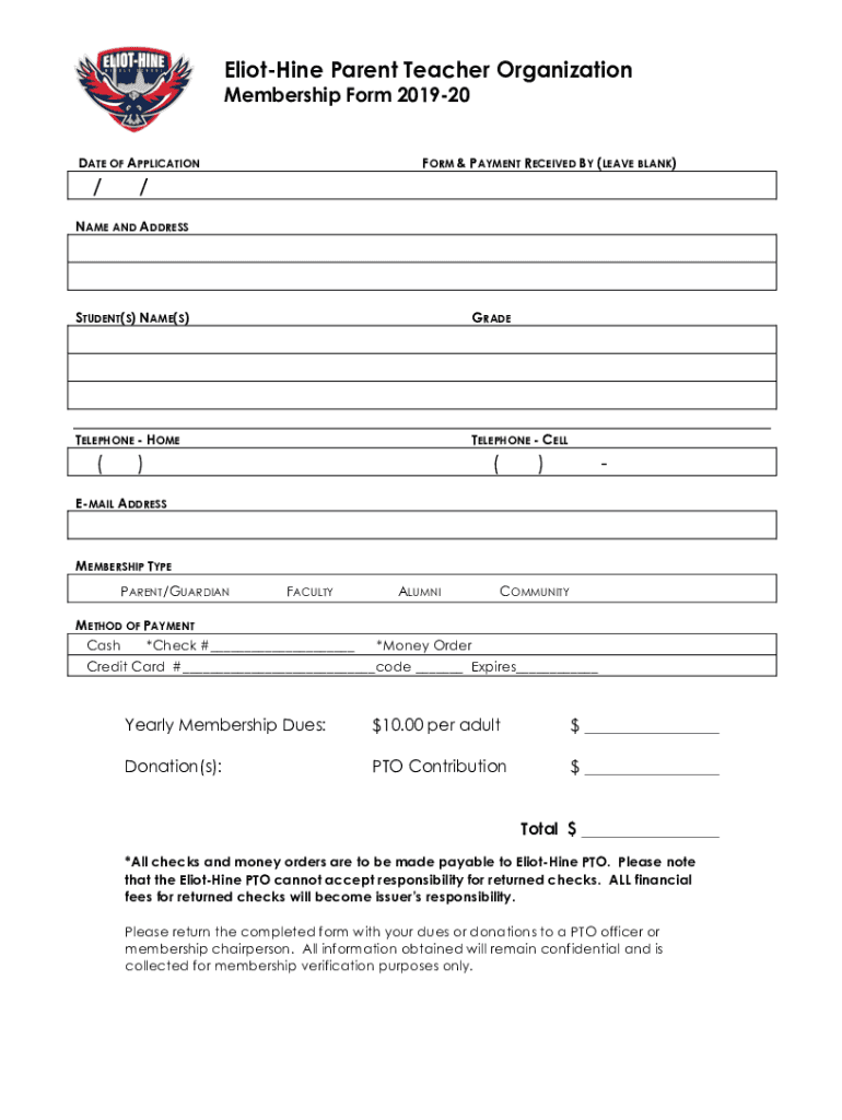 Clothing Parent Teacher Organization Membership Form 201920 DATE OF APPLICATION/FORM & PAYMENT RECEIVED BY (LEAVE BLANK)/NAME AND ADDRESSSTUDENT(S) NAME(S)RADIOTELEPHONE HOMETELEPHONE CELL()()EMAIL
