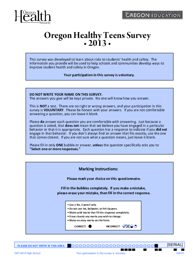 Oregon Healthy Teens Survey 2013 This survey was developed to learn about risks to students health and safety. The information you provide will be used to help schools and communities develop ways