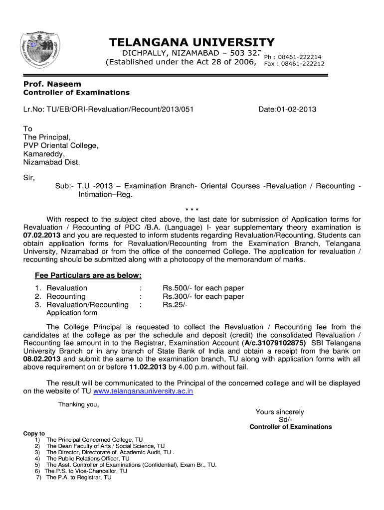 TELANGANA UNIVERSITY DIGITALLY, ISLAMABAD 503 322 pH : 08461222214 (Established under the Act 28 of 2006, A.P.) 08461222212 Fax : Prof. Na seem Controller of Examinations Lr. No: TU/EX/Reevaluation/Recount/2013/051