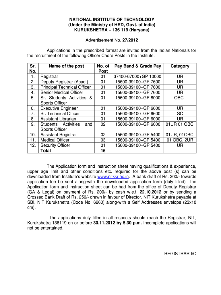 NATIONAL INSTITUTE OF TECHNOLOGY (Under the Ministry of HRD, Govt. of India) KURUKSHETRA 136 119 (Haryana) Advertisement No. 27/2012 Applications in the prescribed format are invited from the Indian