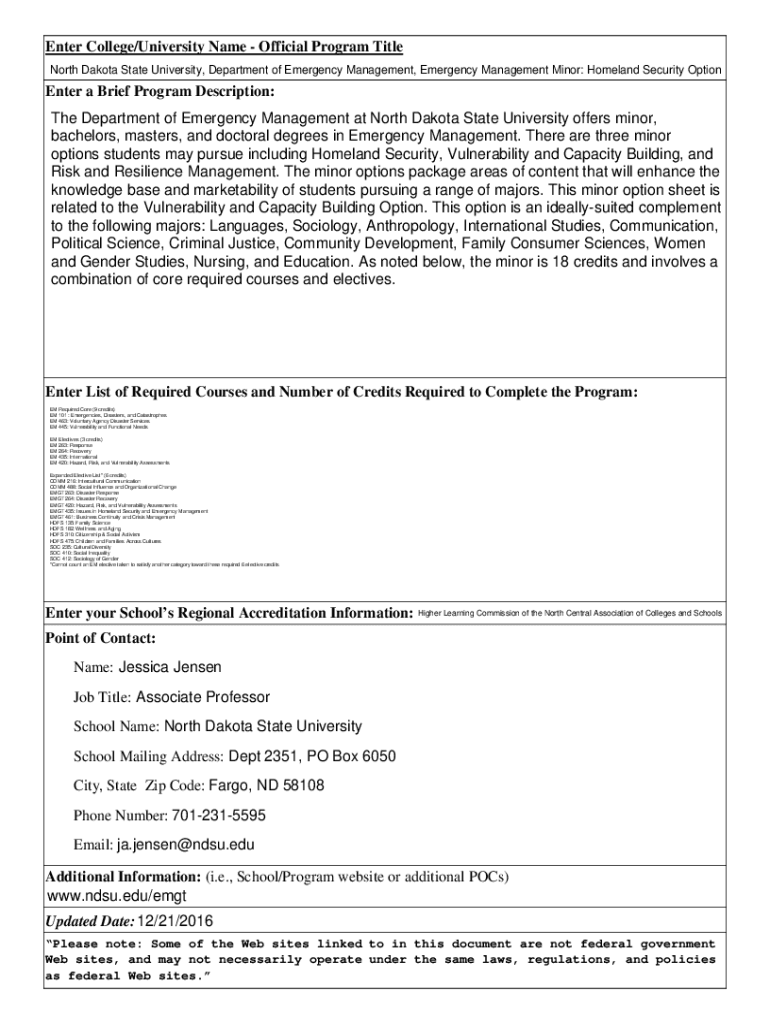 Enter College/University Name Official Program Title North Dakota State University, Department of Emergency Management, Emergency Management Minor: Homeland Security OptionEnter a Brief Program Description: