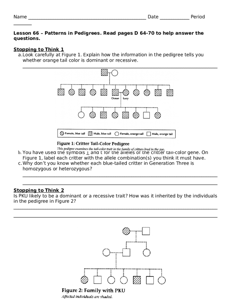The ACTIVITY 66PATTERNS IN PEDIGREES (p. D-64) - Studylib is a writable document you can get completed and signed for specific purpose. In that case, it is provided to the actual addressee to provide certain info of certain kinds. The completion and signing can be done in hard copy or via a suitable solution like PDFfiller. Such applications help to send in any PDF or Word file without printing them out. While doing that, you can customize its appearance according to your requirements and put an official legal digital signature. Once done, the user sends the ACTIVITY 66PATTERNS IN PEDIGREES (p. D-64) - Studylib to the respective recipient or several ones by email or fax. PDFfiller has a feature and options that make your template printable. It includes a variety of options when printing out appearance. It doesn't matter how you deliver a form after filling it out - in hard copy or by email - it will always look well-designed and organized. To not to create a new document from scratch all the time, turn the original Word file as a template. After that, you will have an editable sample.