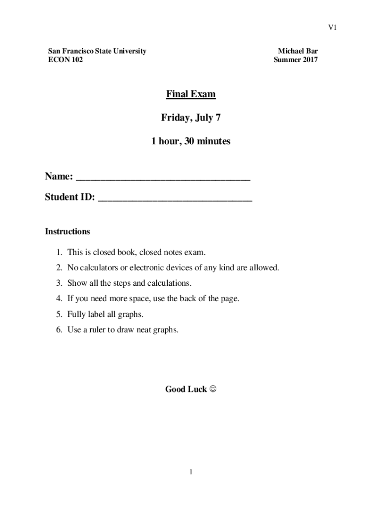 V1 San Francisco State University ECON 102Michael Bar Summer 2017Final Exam Friday, July 7 1 hour, 30 minutesName: Student ID: Instructions 1. This is closed book, closed notes exam. 2. No calculators