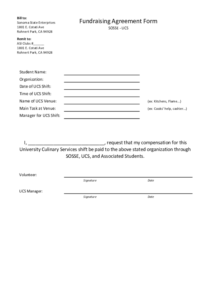 Bill to: Sonoma State Enterprises 1801 E. Coat Ave Robert Park, CA 94928Fundraising Agreement Form POSSE Credit to: AS Clubs # 1801 E. Coat Ave Robert Park, CA 94928Student Name: Organization: Date
