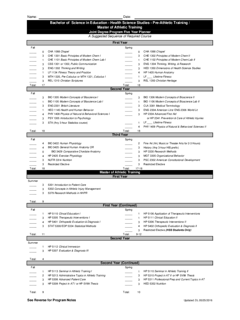 Name:Date:Bachelor of Science in Education Health Science Studies Athletic Training / Master of Athletic Training Joint Degree Program Five Year Planner A Suggested Sequence of Required Course First