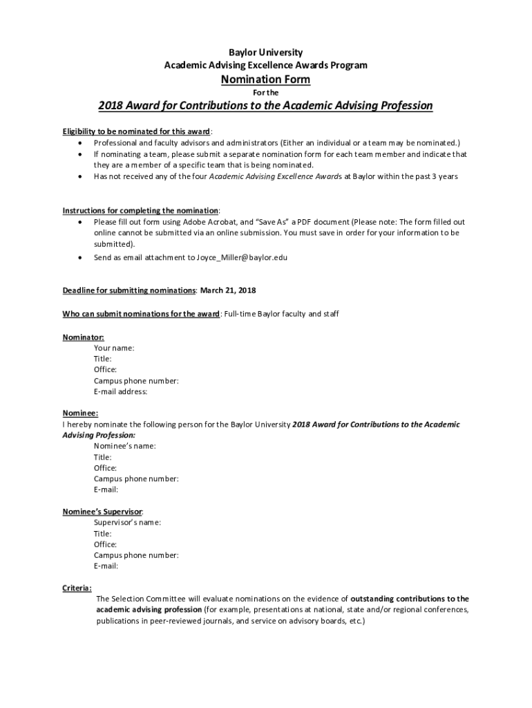 BaylorUniversity AcademicAdvisingExcellenceAwardsProgramNominationForm Forthe2018AwardforContributionstotheAcademicAdvisingProfession Eligibilitytobenominatedforthisaward: Professionalandfacultyadvisorsandadministrators(Eitheranindividualorateammaybenominated.)