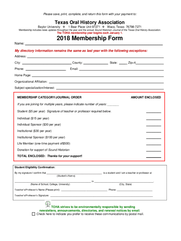 Please save, print, complete, and return this form with your payment to:Texas Oral History Association Baylor University 1 Bear Place Unit 97271 Waco, Texas 767987271 Membership includes news updates