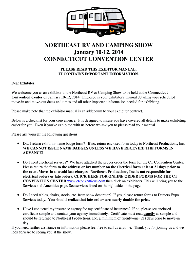 NORTHEAST RV AND CAMPING SHOW January 1012, 2014 CONNECTICUT CONVENTION CENTER PLEASE READ THIS EXHIBITOR MANUAL. IT CONTAINS IMPORTANT INFORMATION. Dear Exhibitor: We welcome you as an exhibitor