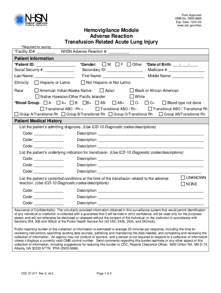 Form Approved OMB No. 09200666 Exp. Date: 12/31/22 www.cdc.gov/nhsnHemovigilance Module Adverse Reaction Transfusion Related Acute Lung Injury *Required for saving×Facility ID#: NHS Adverse Reaction