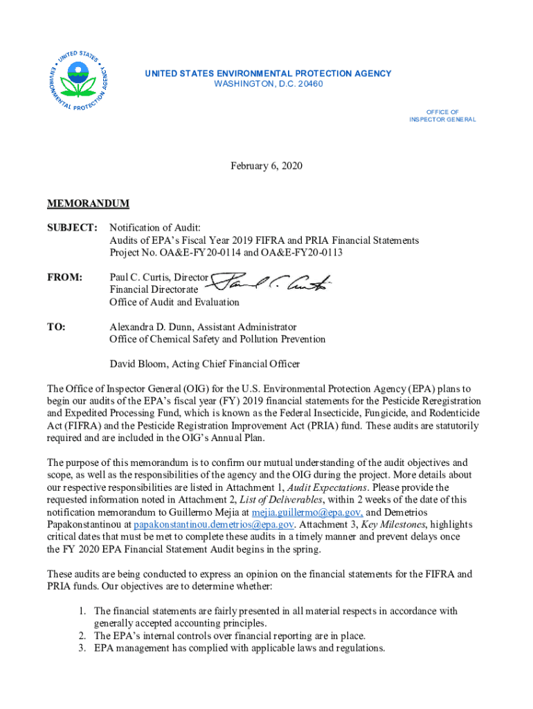 Get the free Audits of EPA's Fiscal Year 2019 FIFRA and PRIA Financial Statements. February 6, 2020
