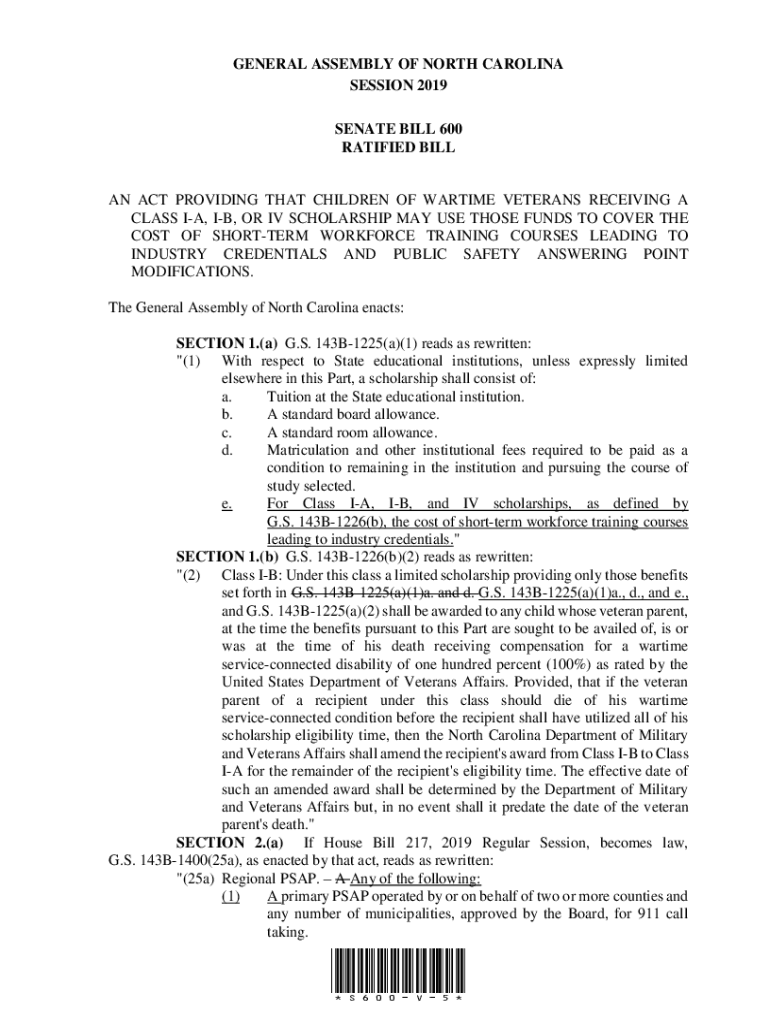 GENERAL ASSEMBLY OF NORTH CAROLINA SESSION 2019 SENATE BILL 600 RATIFIED BIL LAN ACT PROVIDING THAT CHILDREN OF WARTIME VETERANS RECEIVING A CLASS IA, IB, OR IV SCHOLARSHIP MAY USE THOSE FUNDS TO