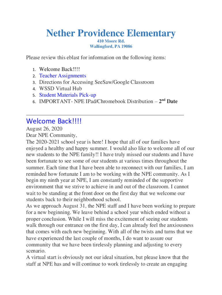 Nether Providence Elementary 410 Moore Rd. Wallingford, PA 19086Please review this blast for information on the following items: 1. 2. 3. 4. 5. 6. Welcome Back!!!! Teacher Assignments Directions for