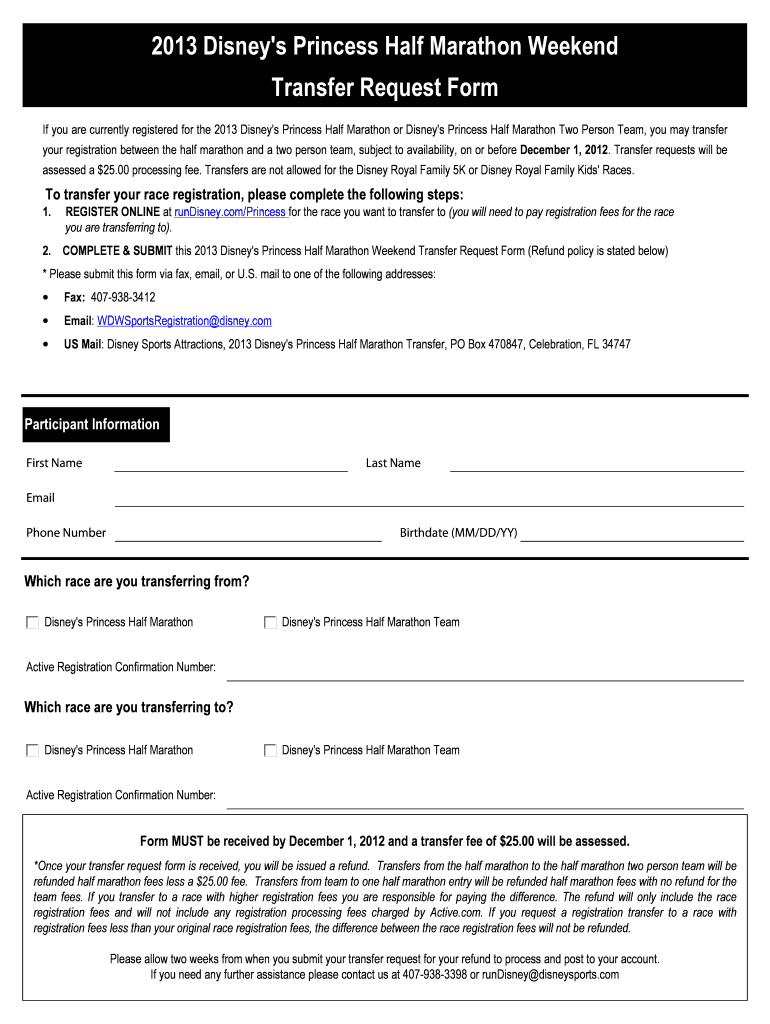 Get the free 2013 Disney's Princess Half Marathon Transfer Request Form