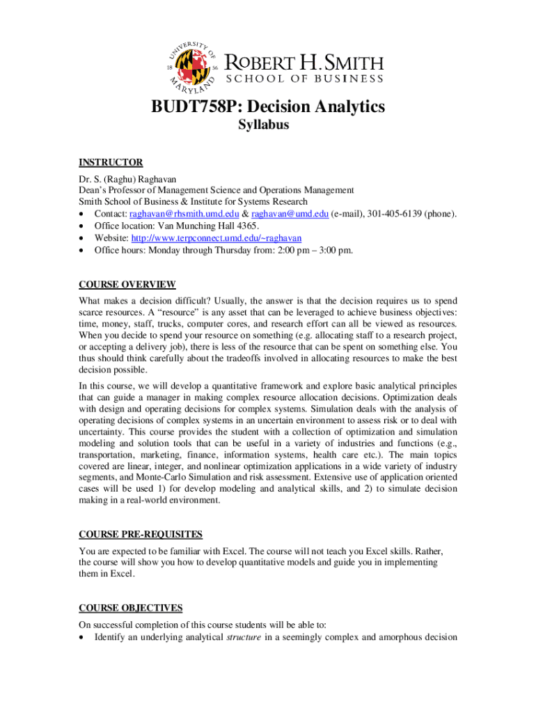 BUDT758P: Decision Analytics Syllabus INSTRUCTOR Dr. S. (Raft) Madhavan Deans Professor of Management Science and Operations Management Smith School of Business & Institute for Systems Research Contact: