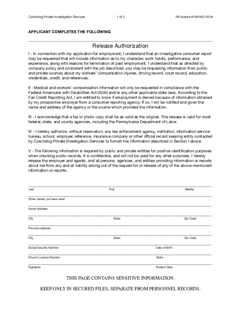 Czech dog Private Investigation Services1 of 2PA license #139MD2018APPLICANT COMPLETES THE FOLLOWINGRelease Authorization In connection with my application for employment, I understand that an investigative