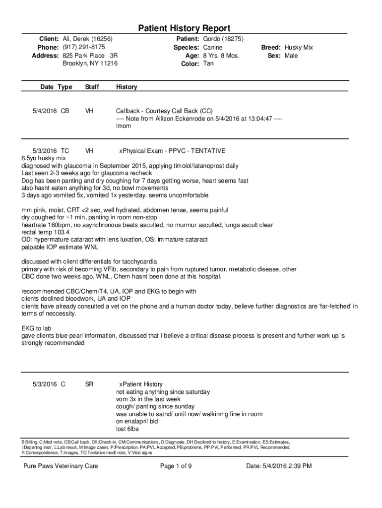 Patient History Report Client: Ali, Derek (16256) Phone: (917) 2918175 Address: 825 Park Place 3R Brooklyn, NY 11216Date Type5/4/2016 Patient: Species: Age: Color:Gordon (18275) Canine 8 Yrs. 8 Mos.