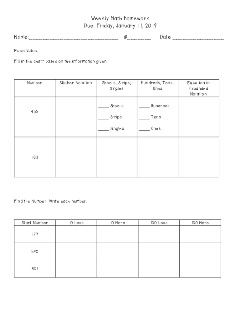 Weekly Math Homework Due: Friday, January 11, 2019, Name: # Date: Place Value: Fill in the chart based on the information given. Number Sticker NotationSheets, Strips, SinglesHundreds, Tens, OnesSheetsHundredsStripsTensSinglesOnes10