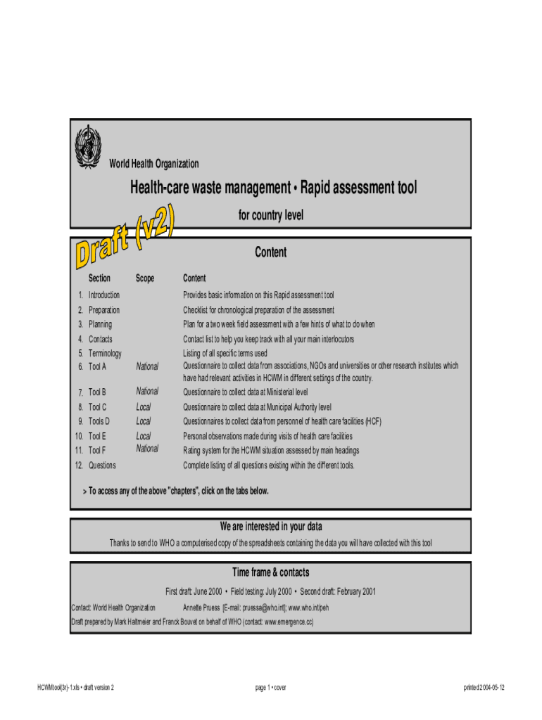 World Health OrganizationHealthcare waste management Rapid assessment tool for country level Content Section 1. 2. 3. 4. 5. 6. 7. 8. 9. 10. 11. 12. Introduction Preparation Planning Contacts Terminology