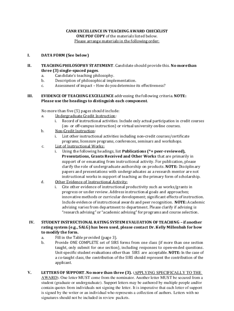 CAN EXCELLENCE IN TEACHING AWARD CHECKLIST ONE PDF COPY of the materials listed below. Please arrange materials in the following order: I.DATA FORM (See below)II.TEACHING PHILOSOPHY STATEMENT. Candidate