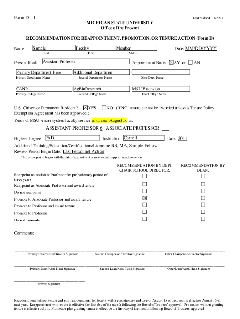 Form DI Last revised 1/2014MICHIGAN STATE UNIVERSITY Office of the Provost RECOMMENDATION FOR REAPPOINTMENT, PROMOTION, OR TENURE ACTION (Form D) Name:SampleFacultyLastPresent RankMemberFirstAssistant