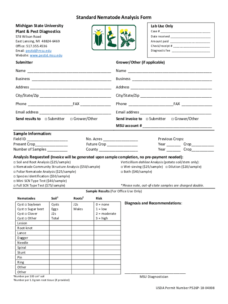 Standard Nematode Analysis Form Michigan State University Plant & Pest Diagnostics Lab Use Only Case # Date received Amount paid Check/receipt # Diagnostic fee 578 Wilson Road East Lansing, MI 488246469