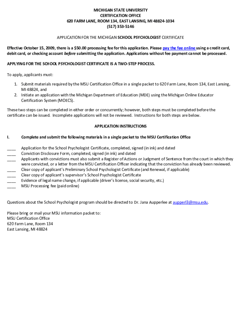 Get the free APPLICATION FOR THE MICHIGAN SCHOOL PSYCHOLOGIST CERTIFICATE - edwp educ msu