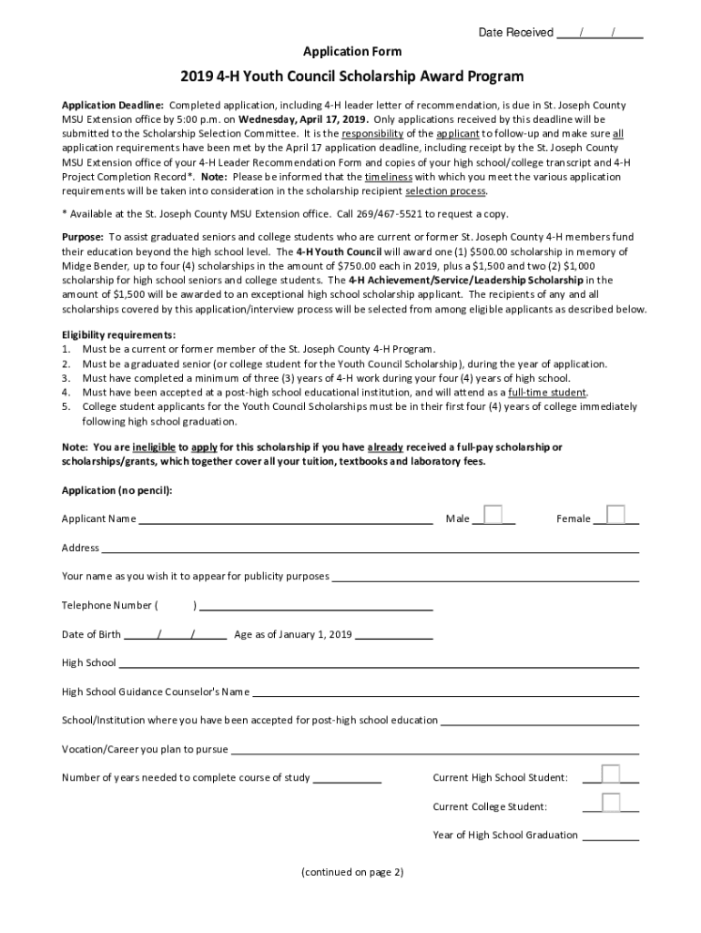 Date Received//Application Form2019 4H Youth Council Scholarship Award Program