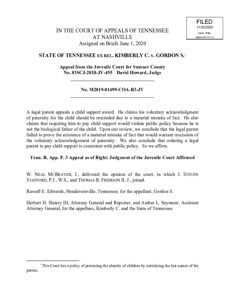 IN THE COURT OF APPEALS OF TENNESSEE AT NASHVILLE11/30/2020Assigned on Briefs June 1, 2020, STATE OF TENNESSEE EX REL. KIMBERLY C. v. GORDON S.1 Appeal from the Juvenile Court for Sumner County No.