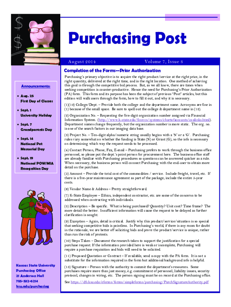 Purchasing Post August 2014Volume 7, Issue 8Completion of the FormsPrior Authorization Announcements: Aug. 25 First Day of Classes Sept. 1 University Holiday Sept. 7 Grandparents Day Sept. 14 National