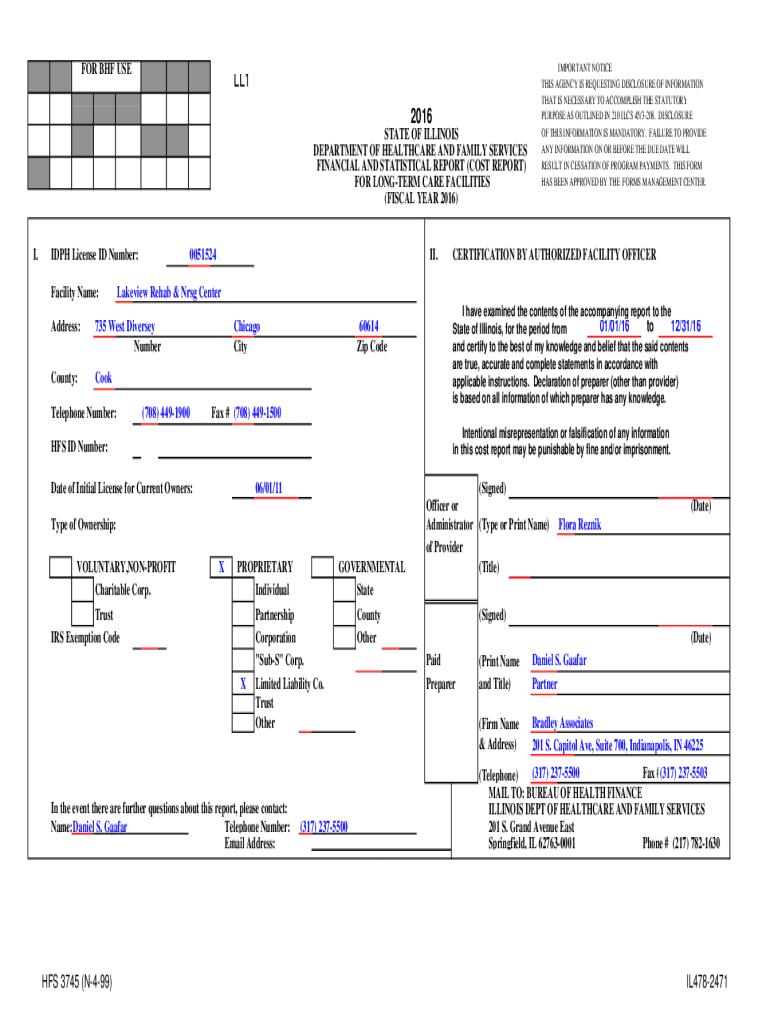 FOR BHF USELL1 2016 STATE OF ILLINOIS DEPARTMENT OF HEALTHCARE AND FAMILY SERVICES FINANCIAL AND STATISTICAL REPORT (COST REPORT) FOR LONGER CARE FACILITIES (FISCAL YEAR 2016)I.DPH License ID Number:
