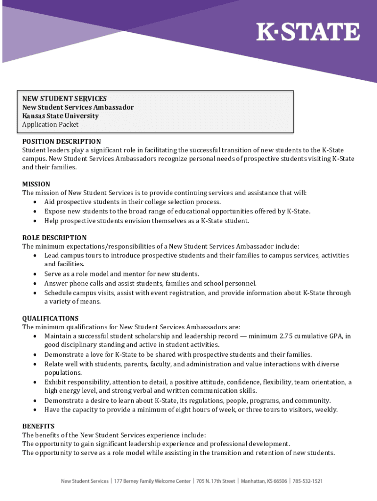 NEW STUDENT SERVICES New Student Services Ambassador Kansas State University Application Packet POSITION DESCRIPTION Student leaders play a significant role in facilitating the successful transition
