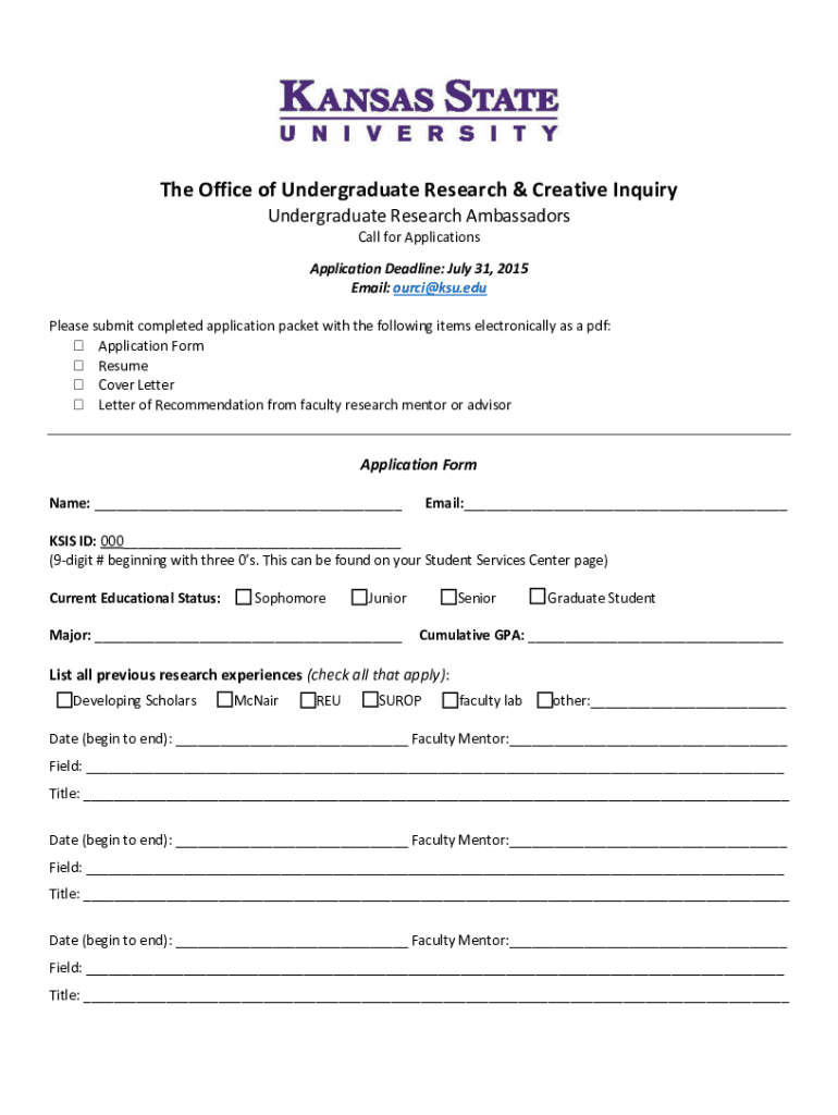The Office of Undergraduate Research & Creative Inquiry Undergraduate Research Ambassadors Call for Applications Application Deadline: July 31, 2015, Email: our CSU.edu Please submit completed application
