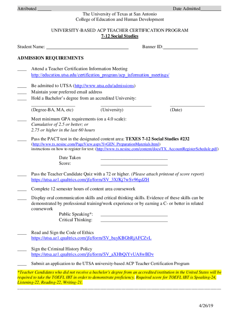 Attributed Date Admitted The University of Texas at San Antonio College of Education and Human DevelopmentUNIVERSITYBASED ACP TEACHER CERTIFICATION PROGRAM 712 Social Studies Student Name:Banner ID:ADMISSION
