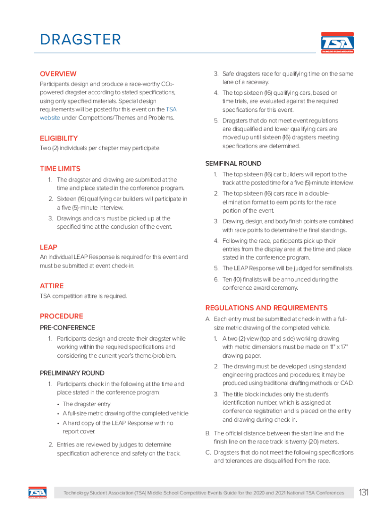 OVERVIEWParticipants design and produce a race worthy CO2powered dragster according to stated specifications,