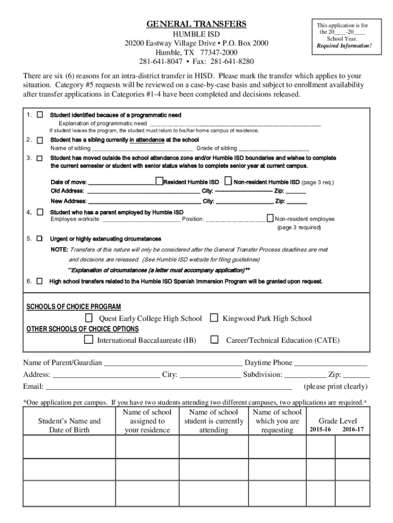 GENERAL TRANSFERSThis application is for the 20 20 School Year. Required Information!HUMBLE ISD 20200 East way Village Drive P.O. Box 2000 Humble, TX 773472000 2816418047 Fax: 2816418280There are