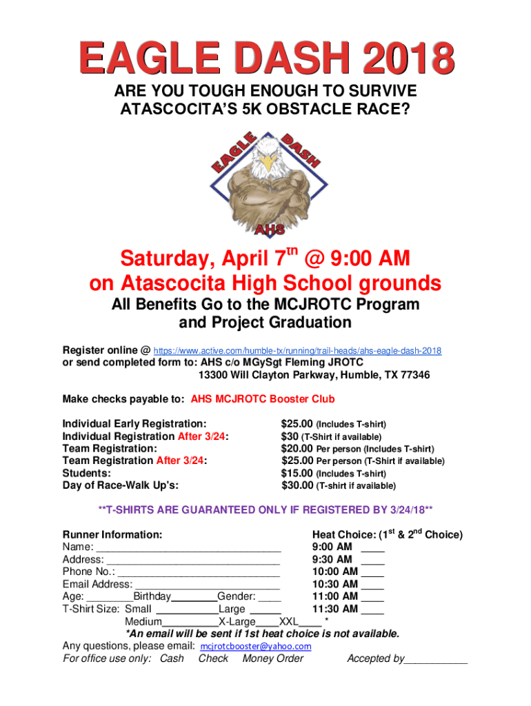 EAGLE DASH 2018 ARE YOU TOUGH ENOUGH TO SURVIVE ATASCOCITA 5K OBSTACLE RACE?Saturday, April 7th 9:00 AM on Atascocita High School grounds All Benefits Go to the MCJ ROTC Program and Project Graduation