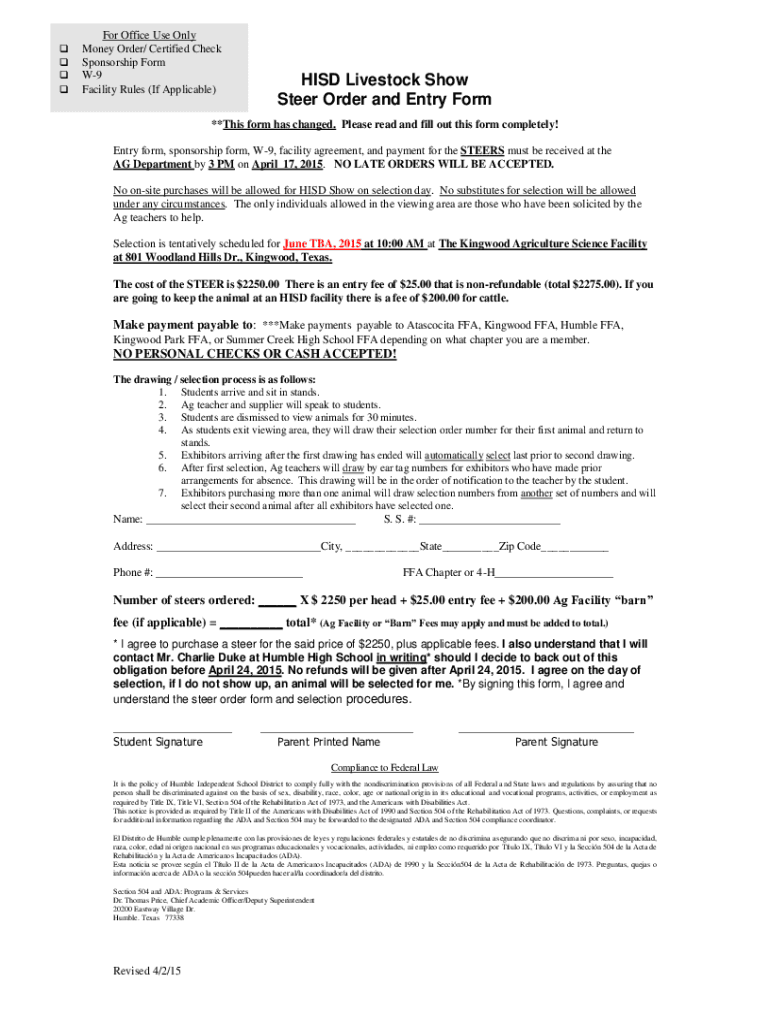 For Office Use Only Money Order/ Certified Check Sponsorship Form W9 Facility Rules (If Applicable)HIS Livestock Show Steer Order and Entry Form**This form has changed. Please read and fill out this