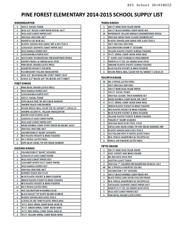 EPI School IDPIN002PINE FOREST ELEMENTARY 20142015 SCHOOL SUPPLY LIST KINDERGARTEN 1 2 2 4 2 1 1 2 1 12 6 3 1 1 2 1100 CT. FACIAL TISSUE 8×10 1/2 RULED COMP BOOK RED BL 36CT 9×12 ASST COAST PAPER