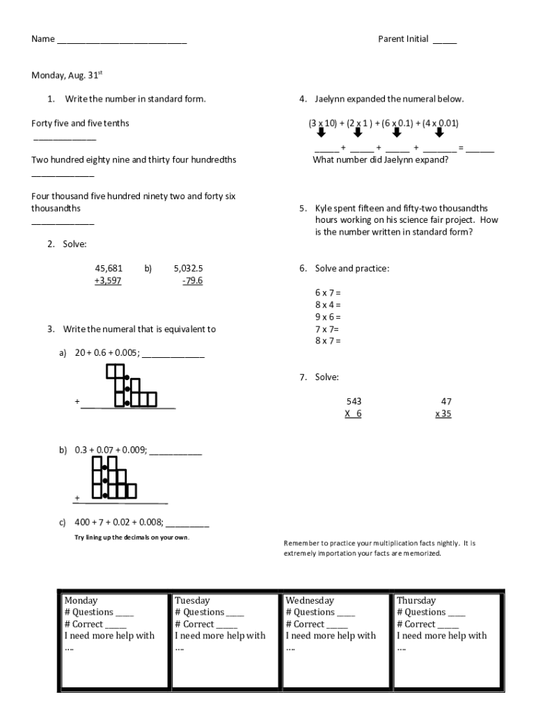 Name Parent Initial Monday, Aug. 31st 1. Write the number in standard form. Forty-five and five tenths 4. Jaelyn expanded the numeral below. (3 × 10) + (2 × 1) + (6 × 0.1) + (4 × 0.01)Two hundred