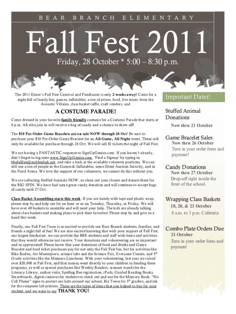 B E A RB R A N C HE L E M E N T A RY Fall Fest 2011 Friday, 28 October * 5:00 8:30 p.m. The 2011 Elmer's Fall Fest Carnival and Fundraiser is only 2 weeks away! Come for a night full of family fun,