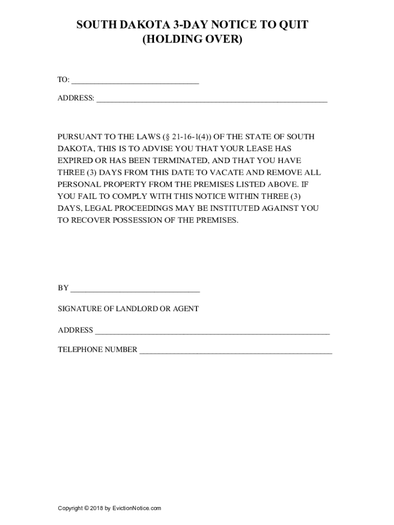 SOUTH DAKOTA 3DAY NOTICE TO QUIT (HOLDING OVER) TO: ADDRESS: PURSUANT TO THE LAWS (21161(4)) OF THE STATE OF SOUTH DAKOTA, THIS IS TO ADVISE YOU THAT YOUR LEASE HAS EXPIRED OR HAS BEEN TERMINATED,